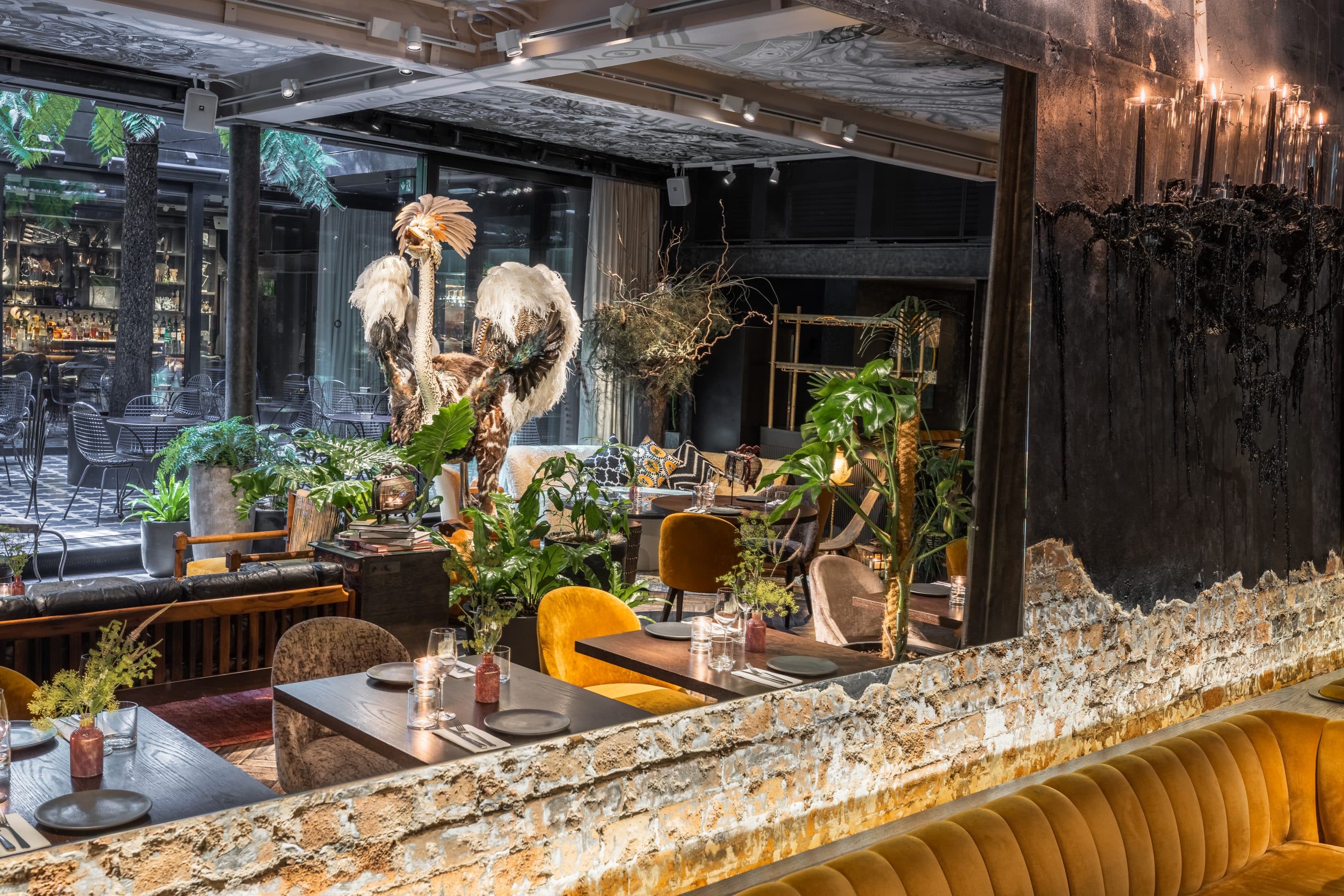 In the bar area, Marco Tullio’s artistic vision transformed the ceiling into a resplendent golden Ziggurat. From this celestial structure, “Mandragora” took root—a captivating canopy crafted from a fusion of metal, resin, and delicate feathers. Illuminated by ambient light, this intricate installation cast a mesmerising play of shadows and reflections, summoning an hallucination of vibrant colours and evoking the mystical powers associated with the legendary Mandrake root.