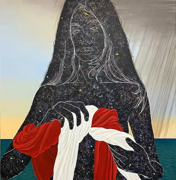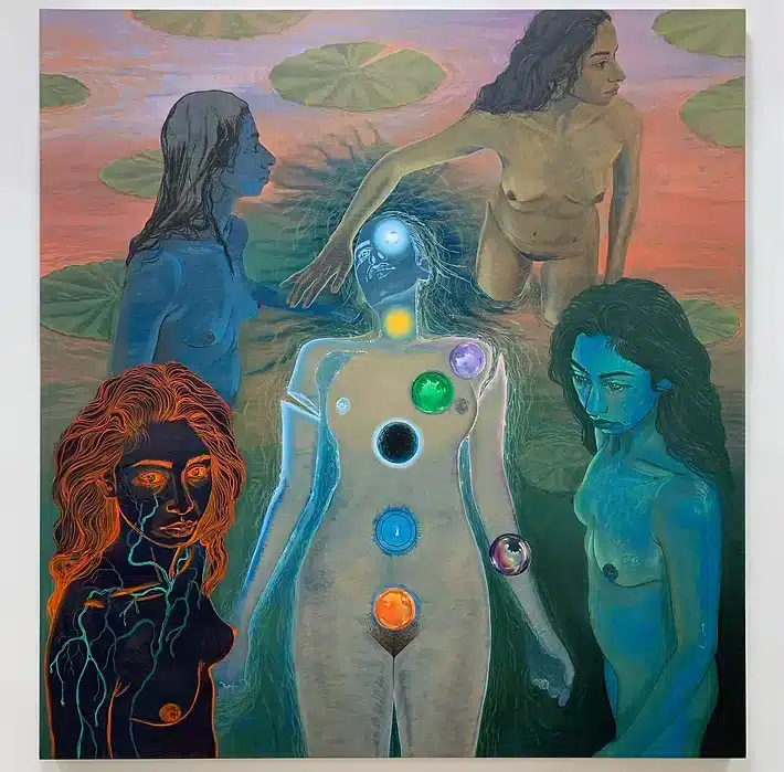 Waheed, who has a Bachelor of Fine Arts from the School of the Art Institute of Chicago, creates allegorical figurative paintings that explore selfhood, choice, rebirth, and redemption. Her experience of upheaval during the pandemic resulted in a turn towards questions of interiority, spirituality, and the search for harmony amidst the clamour of neoliberal modernity.